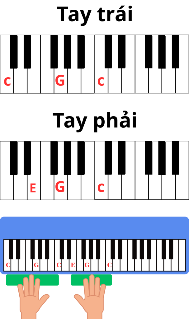 Tay trái nhấn bass (C trầm), tay phải rải C – E – G nhiều lần